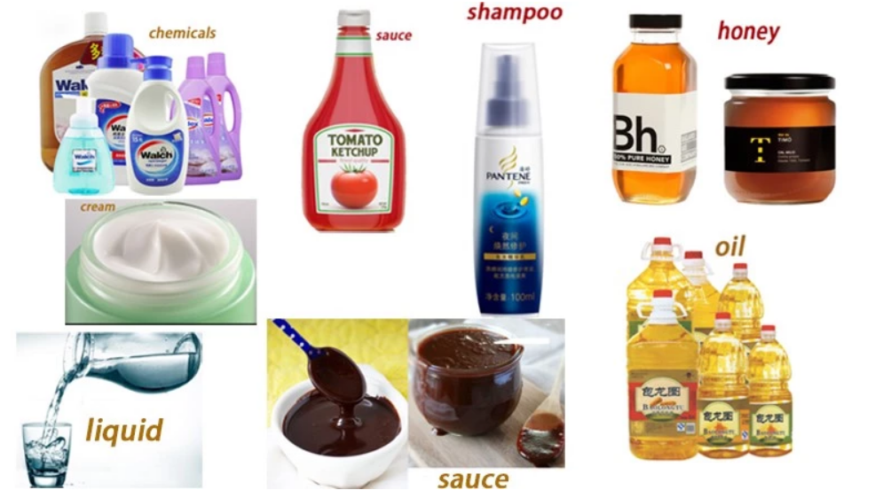 Напіввязкі та в'язкі рідини; котячий, гірчичний, сиропи, сальса, майонез, мед, арахісове масло, желе, соуси для спринцювання, бальзам для губ, шампунь, густе мило, гелі для укладання, маски для обличчя, віск, клей, жир, герметики, силікон та багато іншого