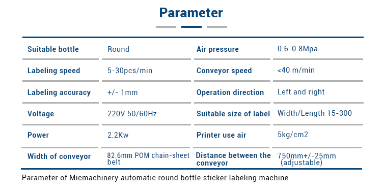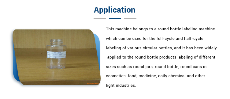 Ця машина належить до машини для маркування круглих пляшок, яка може бути використана для маркування різних кругових пляшок на повний цикл та пів циклу, і вона широко застосовується для маркування продуктів круглої пляшки різних розмірів, таких як круглі банки, кругла пляшка , круглі банки в косметиці, харчовій промисловості, медицині, щоденній хімічній та іншій легкій промисловості. Склад обладнання: електричний шафа, механізм транспортування, пристрій окремої пляшки, пристрій рулонної етикетки, пристрій етикетки кисті, 1 # маркувальний двигун, операційна система та система управління.